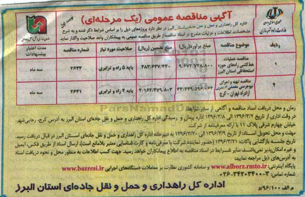 اداره کل راهداری و حمل و نقل جاده ای استان البرز در نظر دارد پروژه های ذیل را بر اساس شرایط ذکر شده و به شرح مشخصات اطلاعات و جزییات مندرج در اسناد مناقصه از طریق مناقصه عمومی به پیمانکاران واجد صلاحیت واگذار نماید