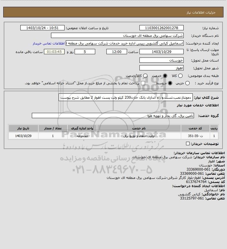 شرح کلی نیاز: دمونتاژ،نصب،تست و راه اندازی بانک خازن230 کیلو ولت پست اهواز 2 مطابق شرح پیوست