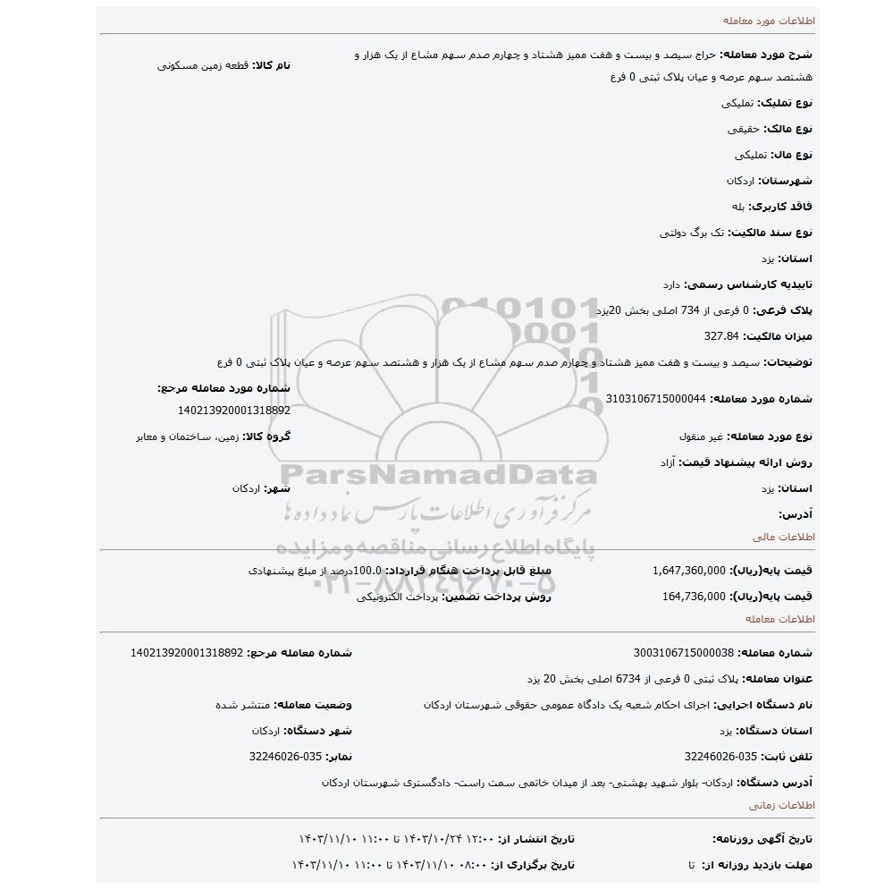 | شرح مورد معامله: حراج سیصد و بیست و هفت ممیز هشتاد و چهارم صدم سهم مشاع از یک هزار و هشتصد سهم عرصه و عیان پلاک ثبتی 0 فرع | نام کالا: قطعه زمین مسکونی | |
