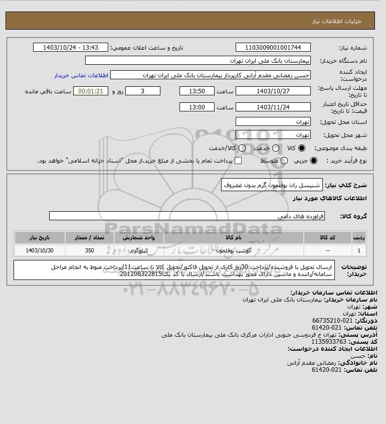 شرح کلی نیاز: شنیسل ران بوقلمون گرم بدون غضروف