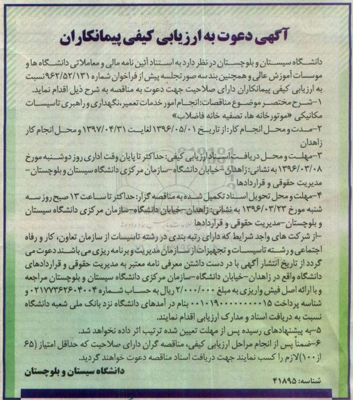 دانشگاه سیستان و بلوچستان در نظر دارد به استناد آیین نامه مالی و معاملاتی دانشگاه ها و موسسات آموزش عالی و همچنین بند سه صورتجلسه پیش از فراخوان شماره 962/52/131 نسبت به ارزیابی کیفی پیمانکاران دارای صلاحیت جهت دعوت به مناقصه به شرح ذیل اقدام نماید.