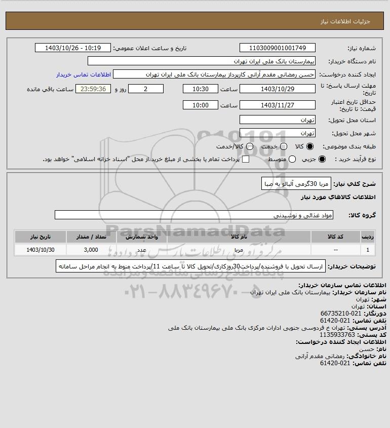 نام سازمان خریدار: بیمارستان بانک ملی ایران تهران