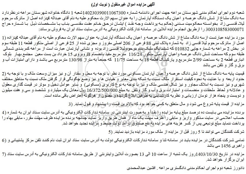 شعبه دوم اجرای احکام مدنی شهرستان مراغه جهت اجرای دادنامه شماره 140230390011067300شعبه 1 دادگاه خانواده شهرستان مراغه درنظردارد سه دانگ مشاع از شش دانگ عرصه و اعیان یک دستگاه آپارتمان را به عنوان سهم الارث محکوم علیه به نام آقای عبداله محمدزاده اصل از ماترک مرحوم لیلا قدسی زاد  بخواسته محکومیت مدنی (حکم به پرداخت وجه نقد ) ایشان درحق خانم عفت مقدسی بناب با مشخصات ذیل  با شماره حراج 3003108583000071 را ازطریق انجام مزایده آنلاین در سامانه تدارکات الکترونیکی به آدرس سایت ستاد ایران به فروش برساند: