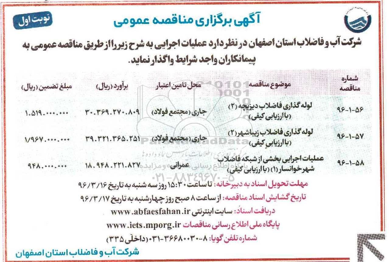 شرکت آب و فاضلاب استان اصفهان درنظردارد عملیات اجرایی به شرح زیر را از طریق مناقصه عمومی به پیمانکاران واجد شرایط واگذار نماید .
