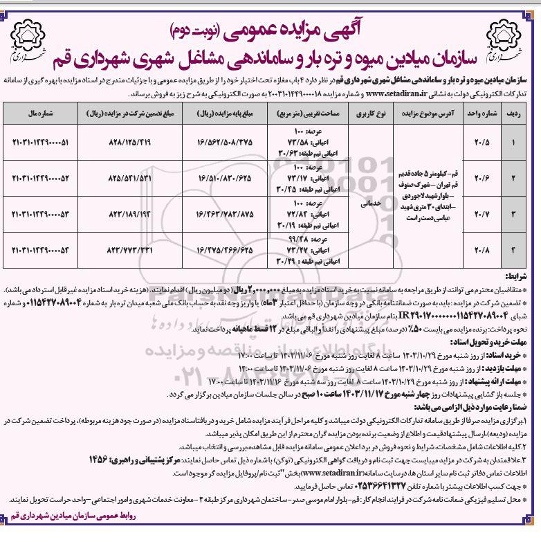 سازمان میادین میوه و تره بار و ساماندهی مشاغل شهری شهرداری قم در نظر دارد 4 باب مغازه تحت اختیار خود را از طریق مزایده عمومی و با جزئیات مندرج در اسناد مزایده یا بهره گیری از سامانه تدارکات الکترونیکی دولت ستاد ایران و شماره مزایده 2003101449000018 به صورت الکترونیکی به شرح زیز به فروش برساند.