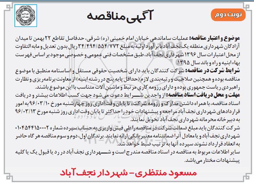 موضوع و اعتبار مناقصه: عملیات ساماندهی خیابان امام خمینی (ره) شرقی ، حدفاصل تقاطع 22 بهمن تا میدان آزادگان شهرداری منطقه یک نجف آباد با براورد اولیه به مبلغ 34.494.554.772 ریال بدون تعدیل و مابه التفاوت از محل اعتبارات سال 96 شهرداری نجف آباد طبق مشخصات فنی عمومی و خصوصی موجود براساس فهرست بها ابنیه و راه و باند سال 1395