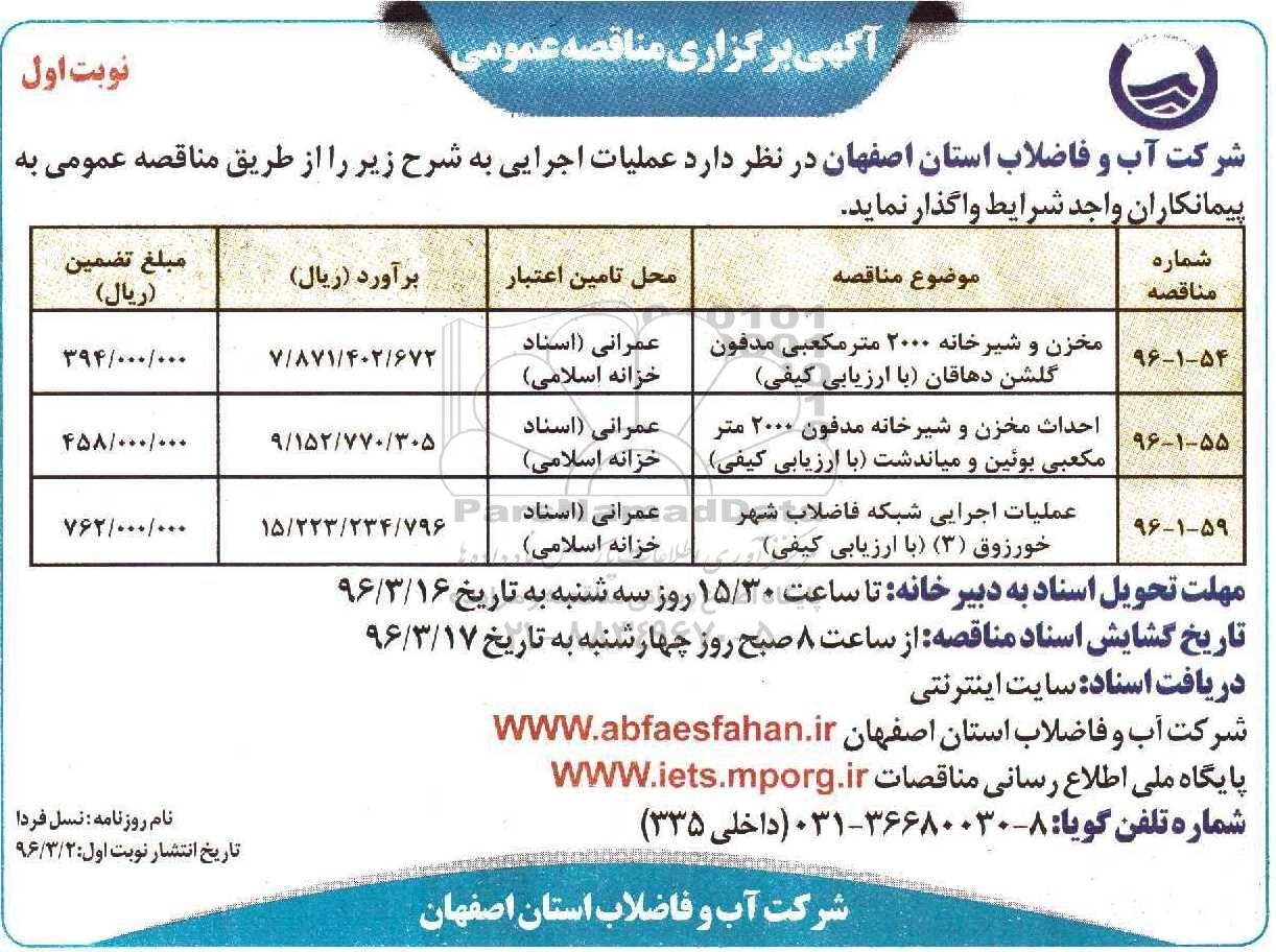 شرکت آب و فاضلاب استان اصفهان در نظر دارد عملیات اجرایی به شرح زیر را از طریق مناقصه عمومی به پیمانکاران واجد شرایط واگذار نماید.