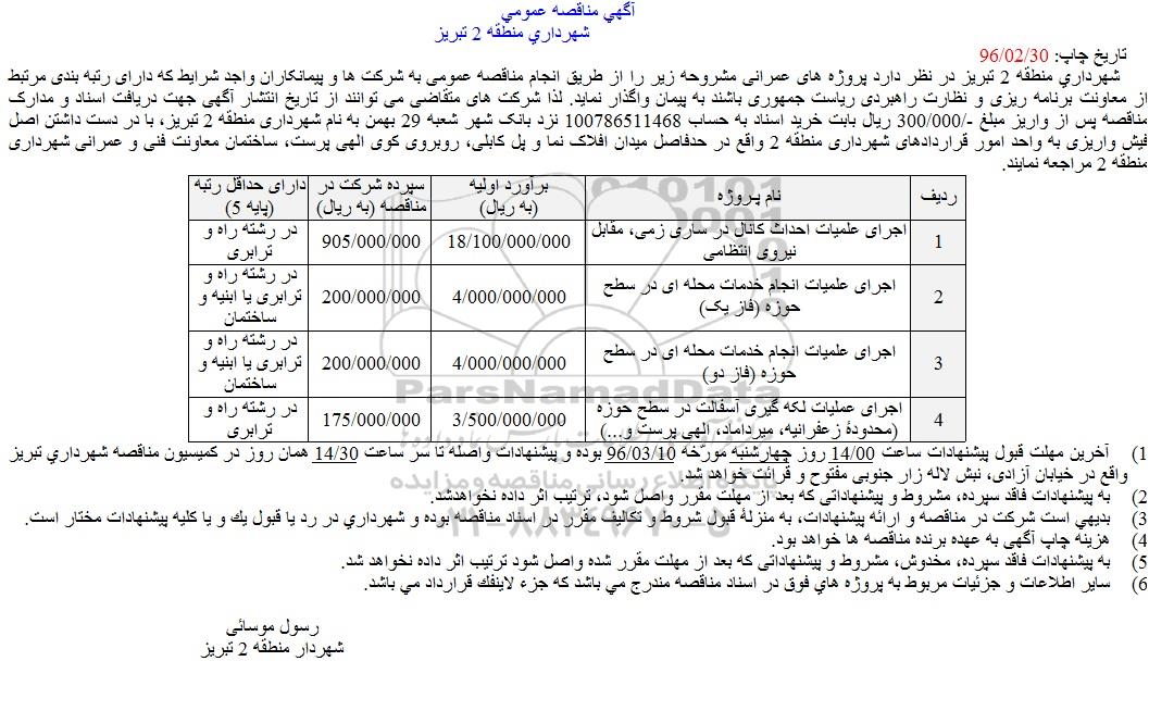 شهرداری منطقه 2 تبریز در نظر دارد پروژه های عمرانی مشروحه زیر را از طریق انجام مناقصه عمومی به شرکت ها و پیمانکاران واجد شرایط که دارای رتبه بندی مرتبط از معاونت برنامه ریزی و نظارت راهبردی ریاست جمهوری باشند به پیمان واگذار نماید. لذا شرکت های متقاضی می توانند از تاریخ انتشار آگهی جهت دریافت اسناد و مدارک مناقصه پس از واریز مبلغ -/300/000 ریال بابت خرید اسناد به حساب 100786511468 نزد بانک شهر شعبه 29 بهمن به نام شهرداری منطقه 2 تبریز، با در دست داشتن اصل فیش واریزی به واحد امور قراردادهای شهرداری منطقه 2 واقع در حدفاصل میدان افلاک نما و پل کابلی، روبروی کوی الهی پرست، ساختمان معاونت فنی و عمرانی شهرداری منطقه 2 مراجعه نمایند.