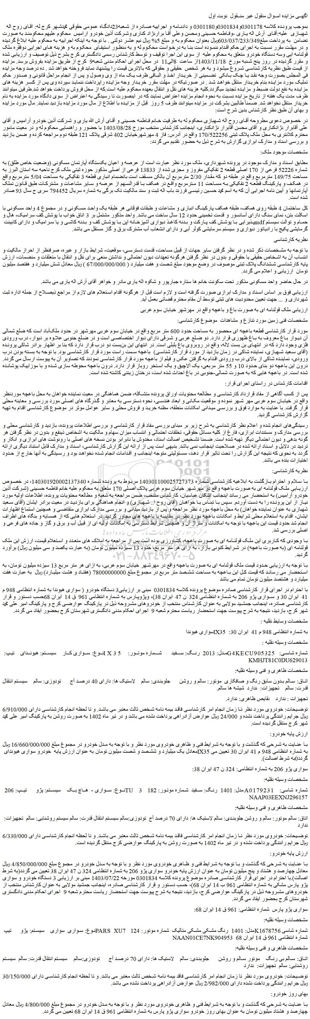 بموجب پرونده کلاسه 0301178و0301834و0301180 و دادنامه و اجراییه صادره از شعبه23دادگاه عمومی حقوقی محمدشهر کرج له: اقای روح اله شهبازی علیه:آقای آرش اله یاری -وفاطمه حسینی و محسن وعلی آقا برارنژاد کناری وشرکت آذین خودرو ارامیس محکوم علیهم محکومند به صورت تضامن به پرداخت مبلغ603/037/233/349ریال بعنوان محکوم به و مبلغ 5% ریال نیم عشر دولتی . با توجه به اینکه اجراییه به محکوم علیه ابلاغ گردیده و در مهلت مقرر نسبت به اجرای حکم اقدام ننموده است بنا به درخواست محکوم له و به منظور استیفای محکوم به و هزینه های اجرایی دوفقره ملک قولنامه ایی وسه دستگاه خودرو متعلق به محکوم علیه از سوی این اجرا توقیف و توسط کارشناس رسمی دادگستری کرج بشرح ذیل توصیف و ارزیابی شده و مقرر گردیده در روز پنج شنبه مورخ 1403/11/18از ساعت 8الی11 در محل اجرای احکام مدنی شعبه9 کرج از طریق مزایده بفروش برسد. مزایده از قیمت طبق نظریه کارشناسی شروع میشود و به هر شخص حقیقی و حقوقی که بالاترین قیمت را پیشنهاد نماید فروخته خواهد شد . ده درصد وجه مزایده فی المجلس بصورت وجه نقد یا چک بانکی تضمینی از خریدار اخذ و الباقی ظرف یک ماه از وی وصول و پس از انجام مراحل قانونی و صدور حکم تملیک مورد مزایده بنام خریدار منتقل خواهد شد . در صورتیکه در مهلت مقرر خریدار وجه مزایده راپرداخت ننماید سپرده وی پس از کسر هزینه های مزایده به نفع دولت ضبط و مزایده تجدید میگردد.کلیه هزینه های نقل و انتقال بعهده محکوم علیه است.که از محل فروش پرداخت خواهد شد.طرفین میتوانند ظرف مدت یک هفته از تاریخ مزایده نسبت به نحوه انجام مزایده اعتراض نمایند که در اینصورت تا رسیدگی به اعتراض از سوی دادگاه مورد مزایده به نام خریدار منتقل نخواهد شد. ضمناً طالبین بشرکت در مزایده میتوانند ظرف 5 روز قبل از مزایده با اطلاع از مال مورد مزایده بازدید نمایند. مال مورد مزایده و بهای آن طبق نظر کارشناس بدین شرح است: