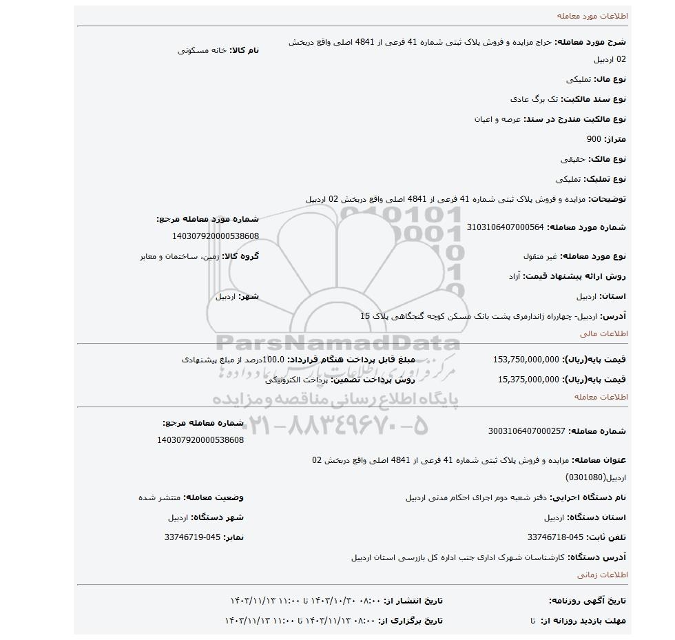 عنوان معامله: مزایده و فروش پلاک ثبتی شماره 41 فرعی از 4841 اصلی واقع دربخش 02 اردبیل(0301080) | ||