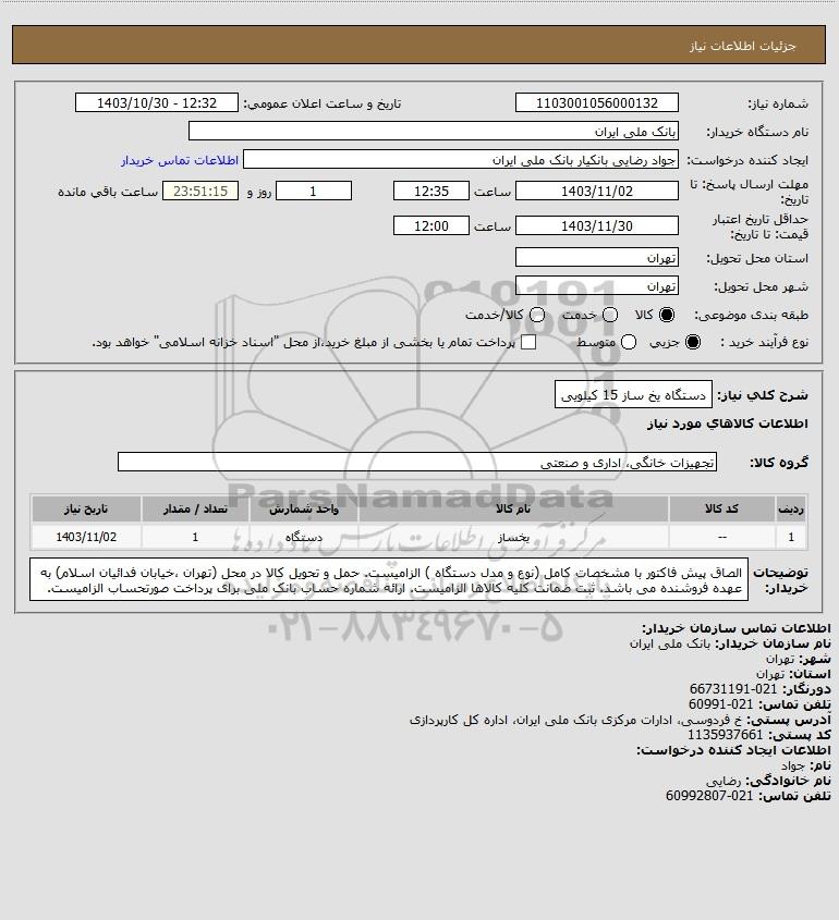 شرح کلی نیاز: دستگاه یخ ساز 15 کیلویی