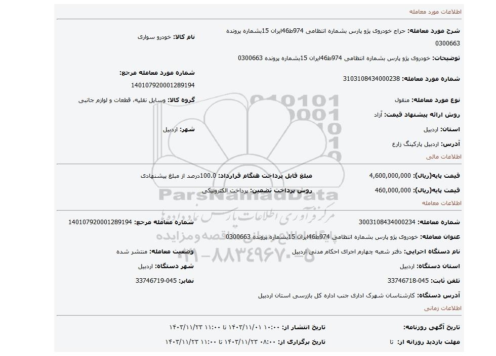 عنوان معامله: خودروی پژو پارس بشماره انتظامی 974ط46ایران 15بشماره پرونده 0300663 | ||