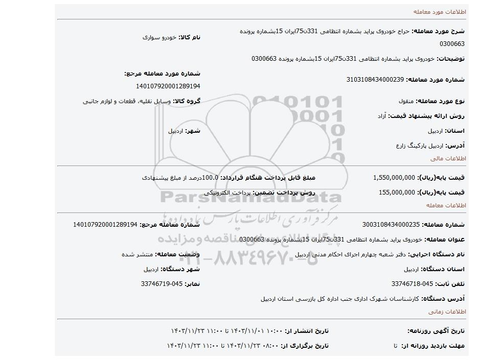 عنوان معامله: خودروی پراید بشماره انتظامی 331ن75ایران 15بشماره پرونده 0300663 | ||