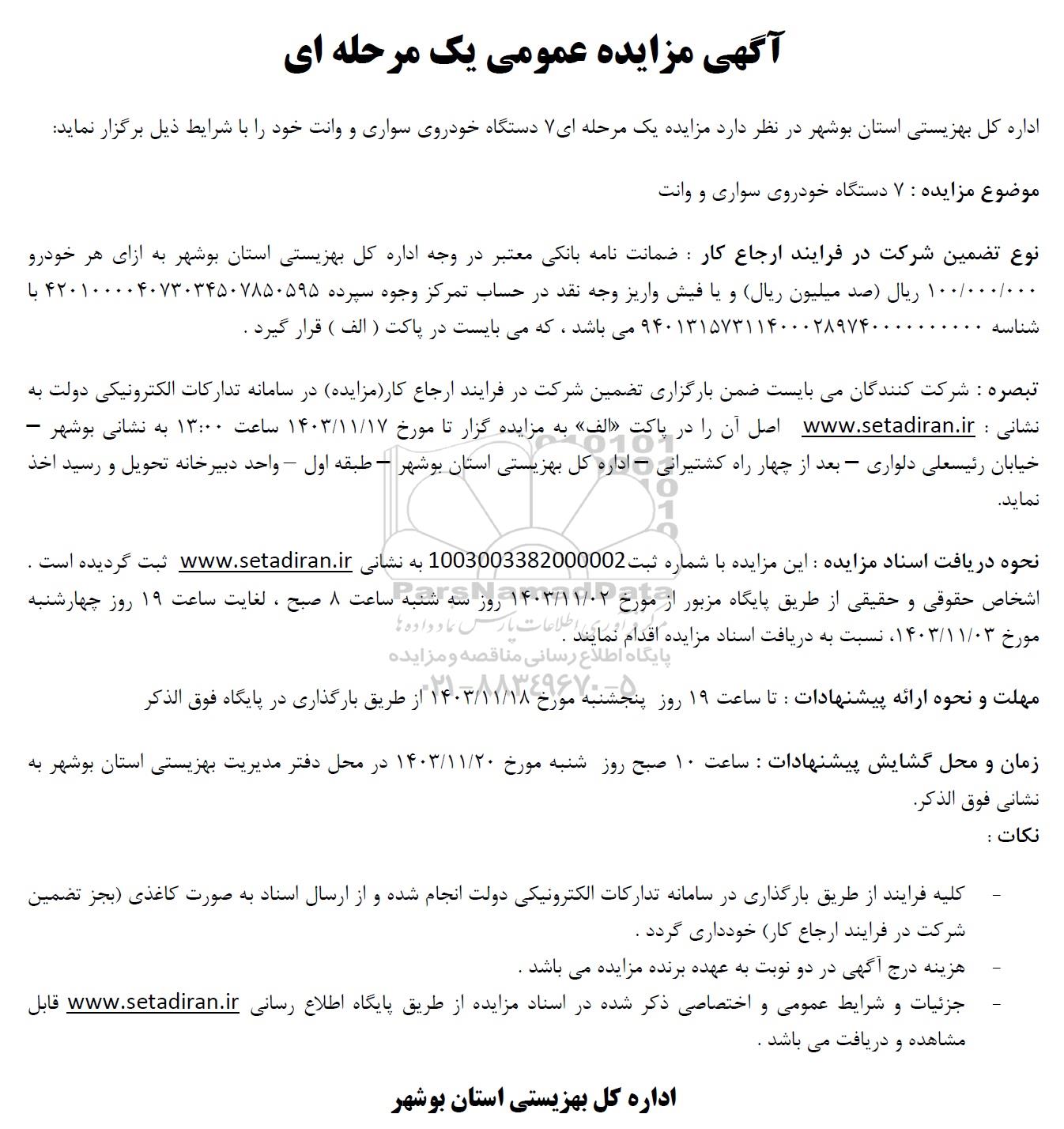 اداره کل بهزیستی استان بوشهر در نظر دارد مزایده یک مرحله ای 7 دستگاه خودروی سواری و وانت خود را با شرایط ذیل برگزار نماید.