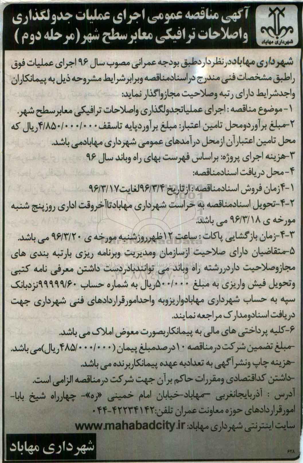 شهرداری مهاباد در نظر دارد طبق بودجه عمرانی مصوب سال 96 اجرای عمیات فوق را طبق مشخصات فنی مندرج در اسناد مناقصه و برابر شرایط مشروحه ذیل به پیمانکاران واجد شرایط دارای رتبه و صلاحیت مجاز و گرید دار واگذار نماید.