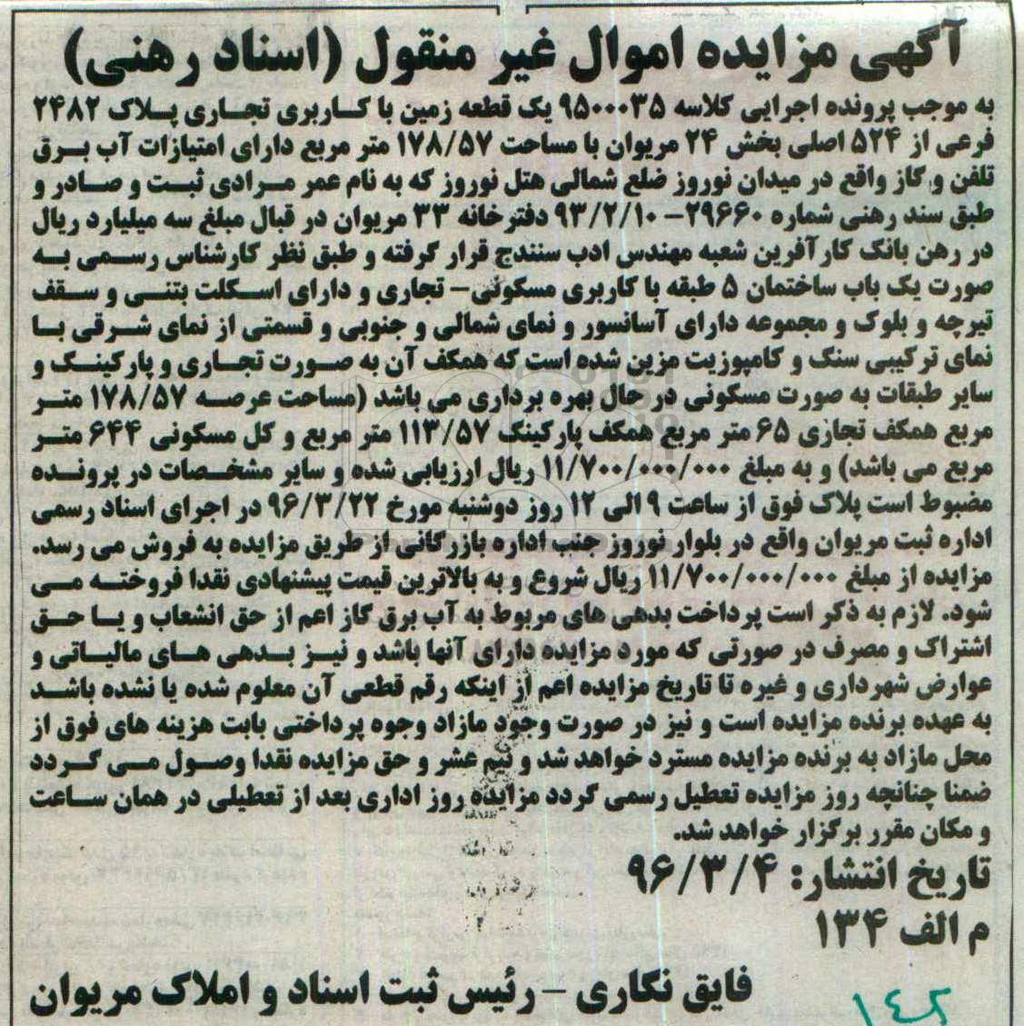 مزایده زمین با کاربری تجاری مساحت 178.57متر کلاسه 9500035