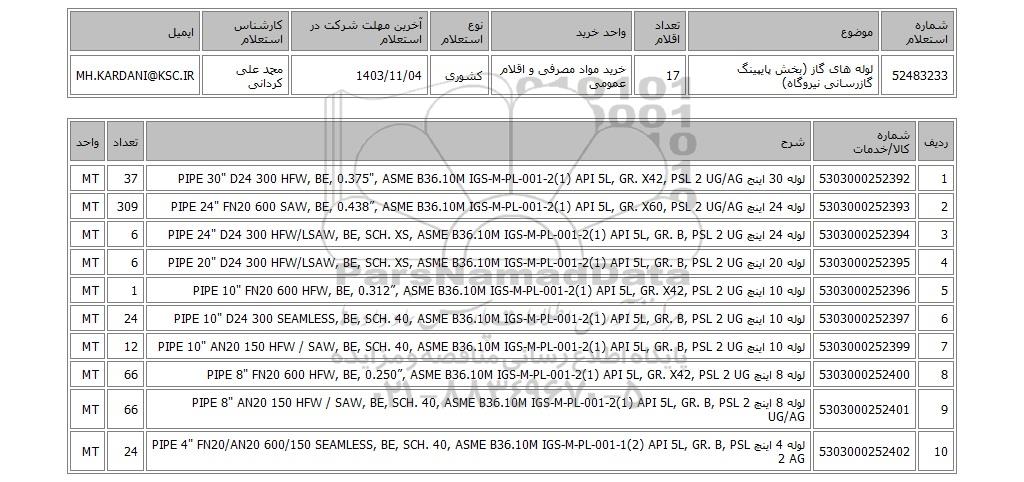 52483233لوله های گاز (بخش پایپینگ گازرسانی نیروگاه)17خرید مواد مصرفی و اقلام عمومیکشوری1403/11/04محمد علی کردانیMH.KARDANI@KSC.IR