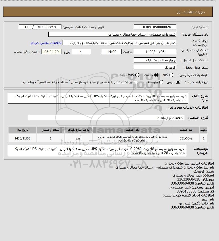 شرح کلی نیاز: خرید سوئیچ سیسکو 48 پورت 2960 G -مودم فیبر نوری داهوا -UPS آنلاین سه کاوا فاراتل-- کابینت باطری UPS هرکدام یک عدد