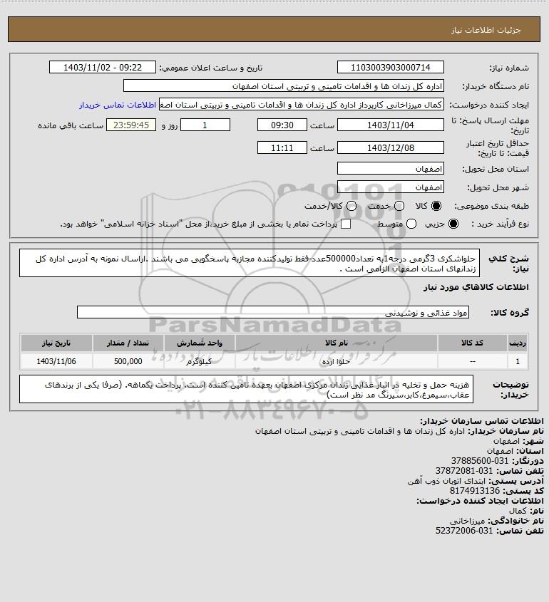 شرح کلی نیاز: حلواشکری 3گرمی درجه1به تعداد500000عدد-فقط تولیدکننده مجازبه پاسخگویی می باشند .اراسال نمونه به آدرس اداره کل زندانهای استان اصفهان الزامی است .