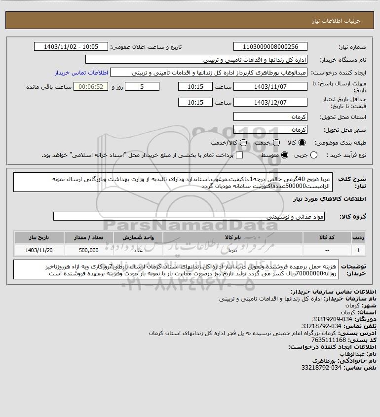| 1 | -- | مربا | عدد | 500,000 | 1403/11/20 |
