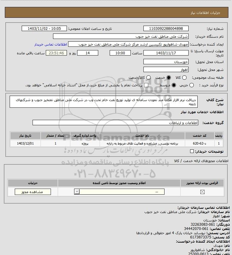 شرح کلی نیاز: دریافت نرم افزار مکان مند نمودن سامانه ی تولید توزیع نفت خام تحت وب در شرکت ملی مناطق نفتخیز جنوب و شرکتهای تابعه