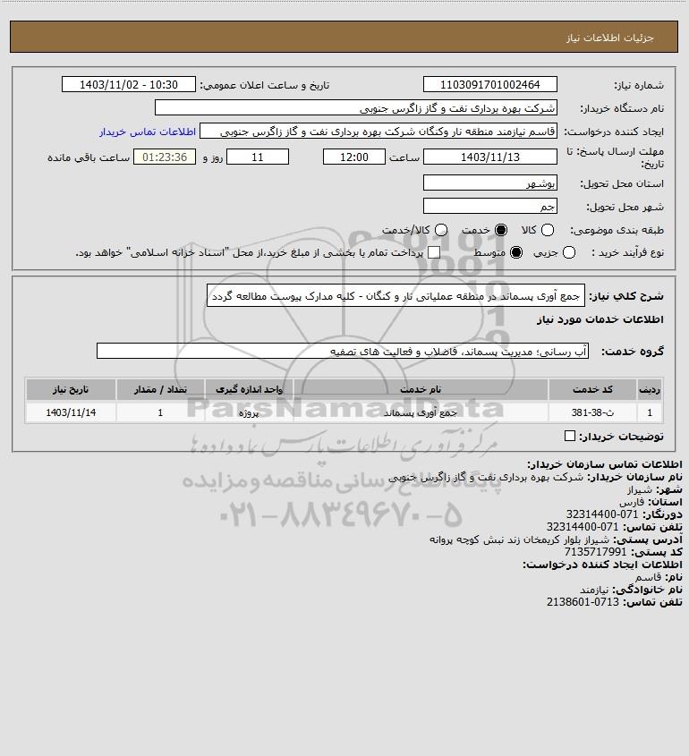 شرح کلی نیاز: جمع آوری پسماند در منطقه عملیاتی نار و کنگان - کلیه مدارک پیوست مطالعه گردد