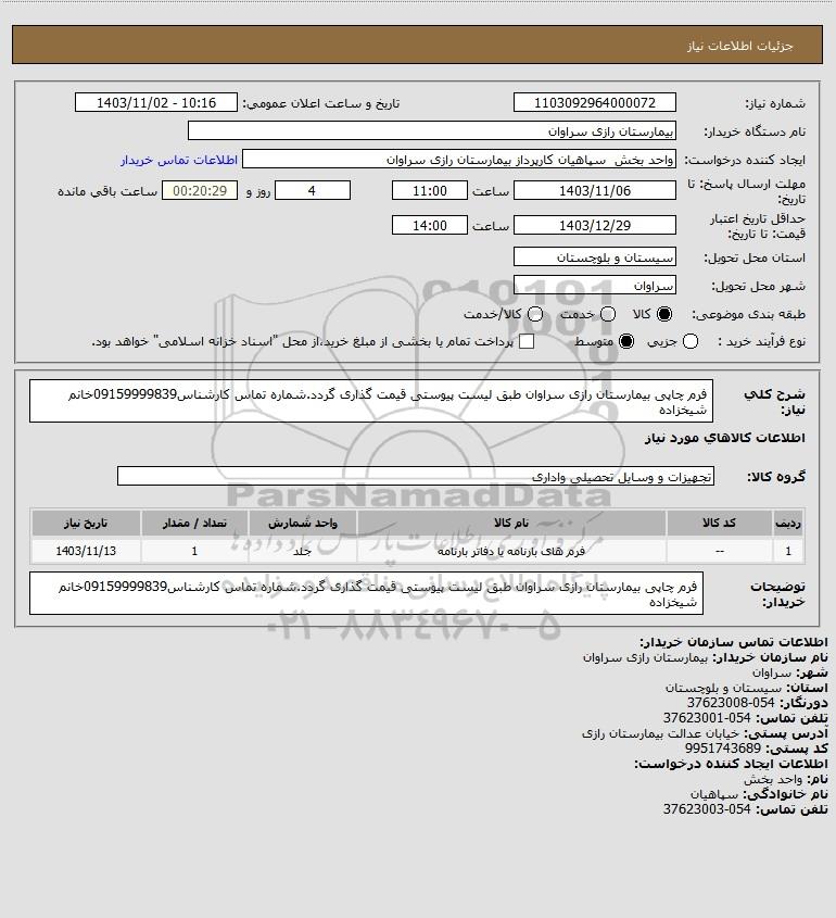 شرح کلی نیاز: فرم چاپی بیمارستان رازی سراوان طبق لیست پیوستی قیمت گذاری گردد.شماره تماس کارشناس09159999839خانم شیخزاده