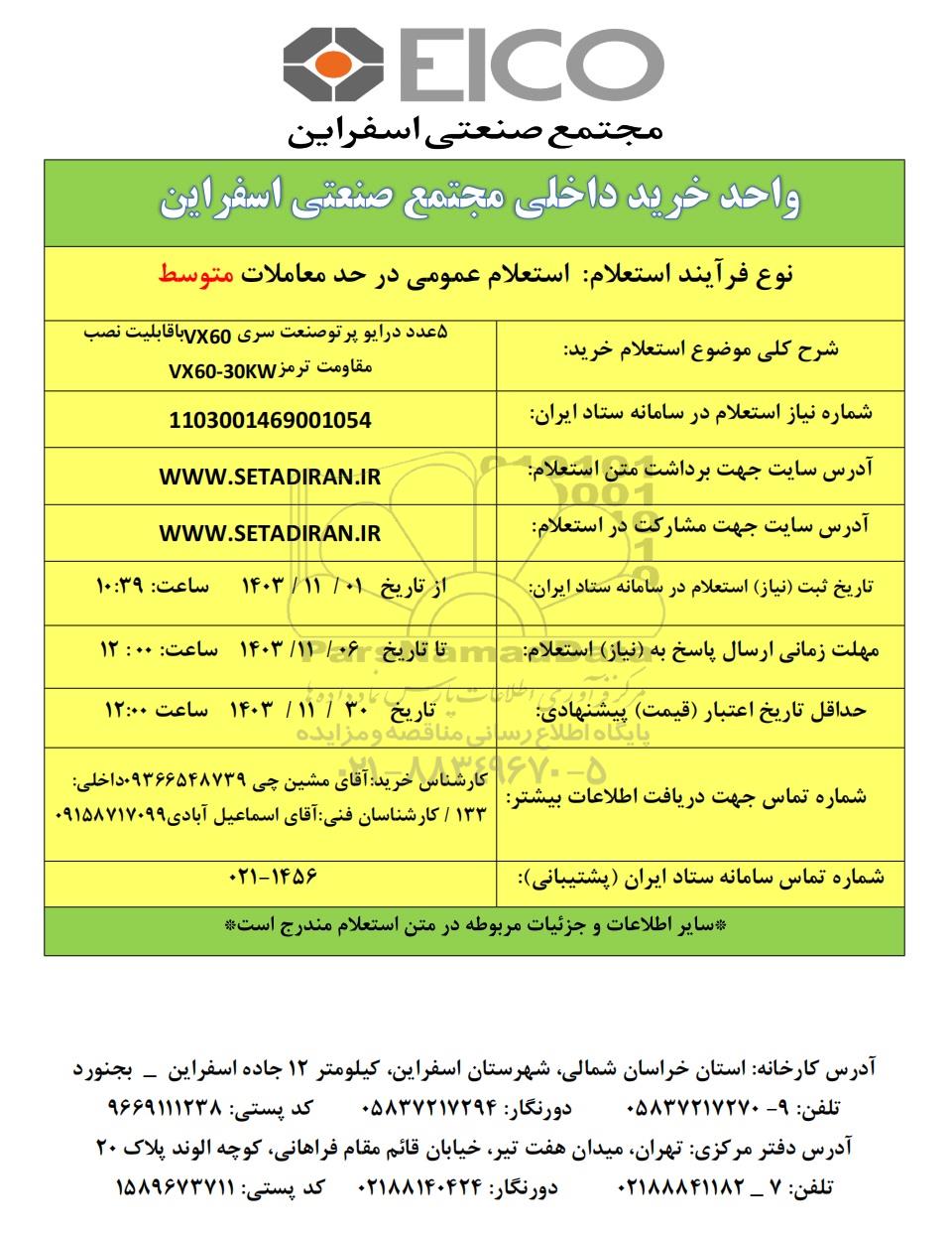 شماره نیاز استعلام در سامانه ستاد ایران: 1103001469001054