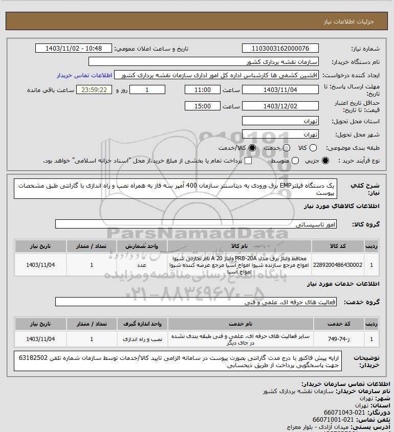 شرح کلی نیاز: یک دستگاه فیلترEMP برق ورودی به دیتاسنتر سازمان 400 آمپر سه فاز به همراه نصب و راه اندازی با گارانتی طبق مشخصات پیوست