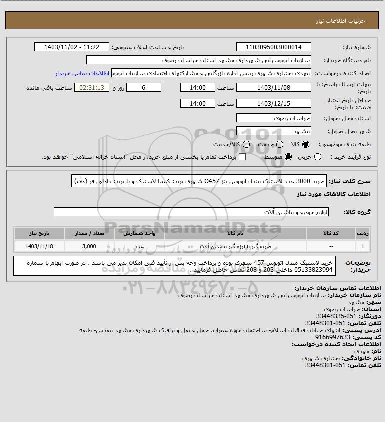 نام دستگاه خریدار:سازمان اتوبوسرانی شهرداری مشهد استان خراسان رضوی