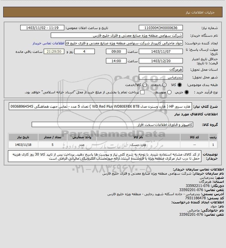 شرح کلی نیاز: هارد سرور HP ( هارد وسترن مدل WD Red Plus WD80EFBX 8TB ) تعداد 5 عدد - تماس جهت هماهنگی 09368964545