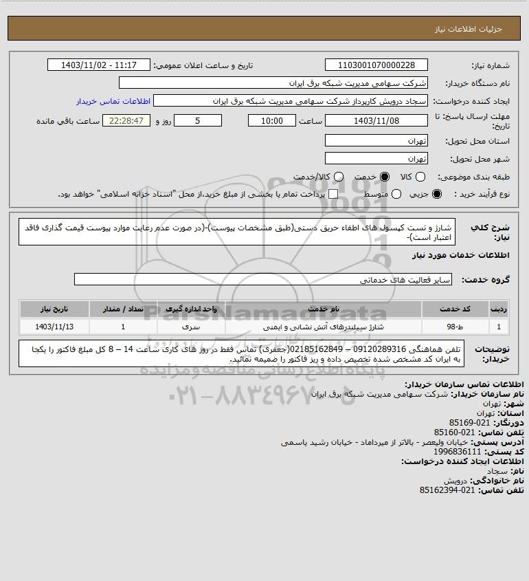 شرح کلی نیاز: شارژ و تست کپسول های اطفاء حریق دستی(طبق مشخصات پیوست)-(در صورت عدم رعایت موارد پیوست قیمت گذاری فاقد اعتبار است)-