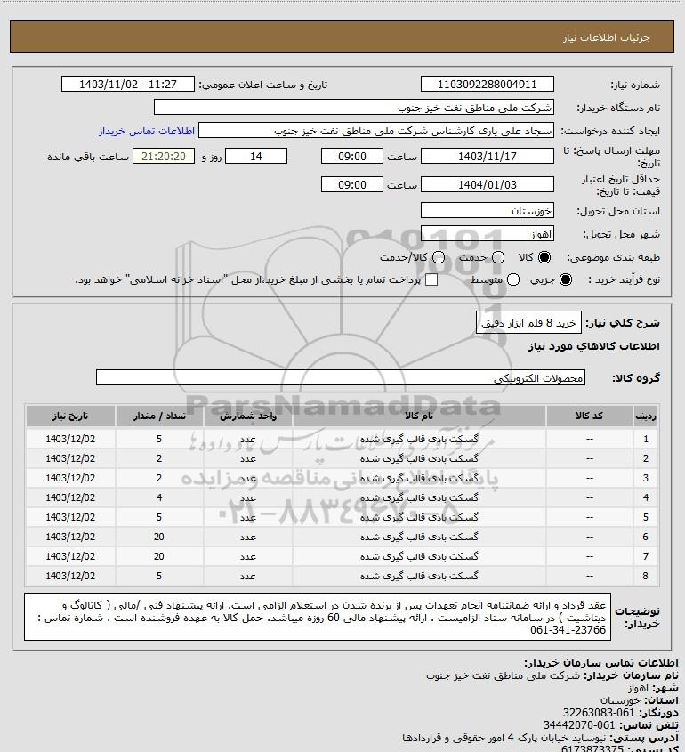 شرح کلی نیاز: خرید 8 قلم ابزار دقیق