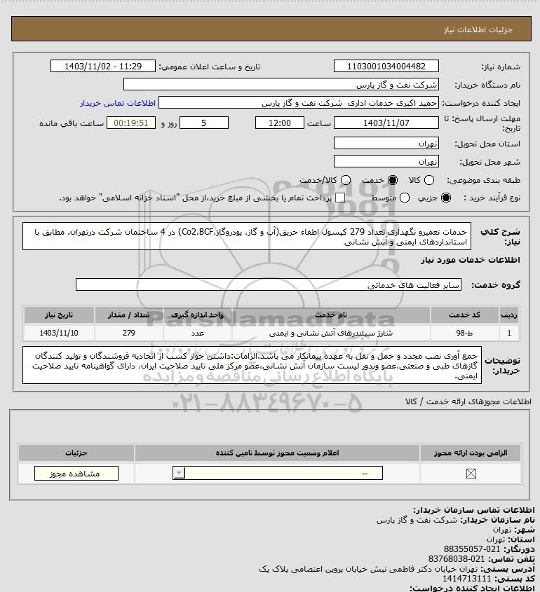شرح کلی نیاز: خدمات تعمیرو نگهداری تعداد 279 کپسول اطفاء حریق(آب و گاز، پودروگاز،Co2،BCF) در 4 ساختمان شرکت درتهران. مطابق با استانداردهای ایمنی و آتش نشانی