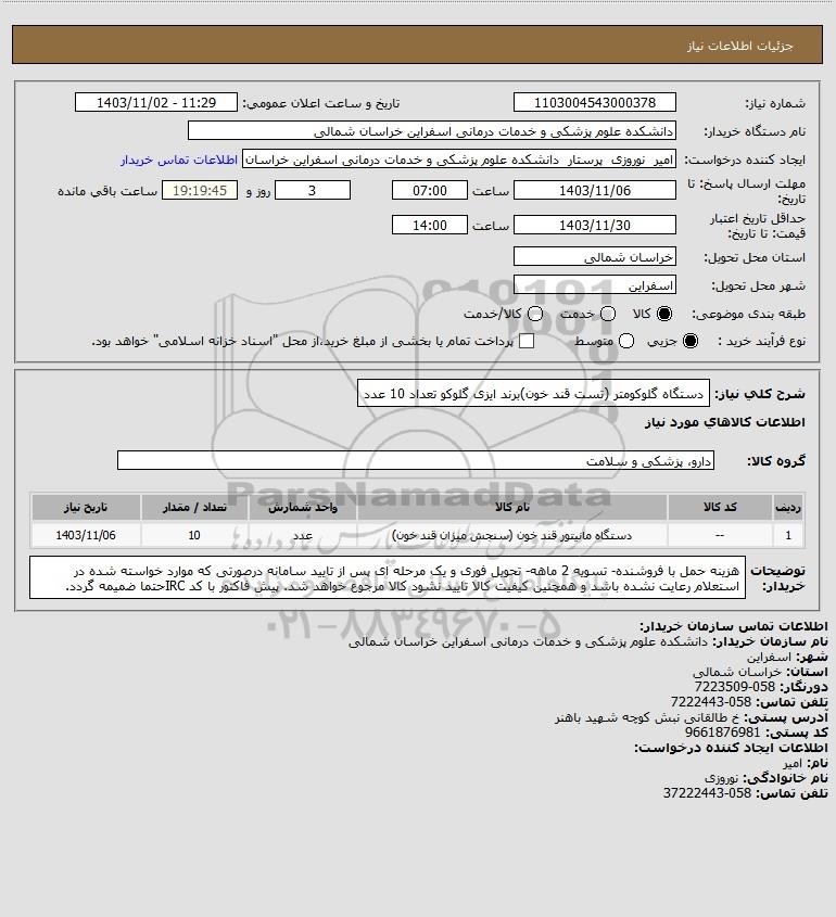| 1 | -- | دستگاه مانیتور قند خون (سنجش میزان قند خون) | عدد | 10 | 1403/11/06 |