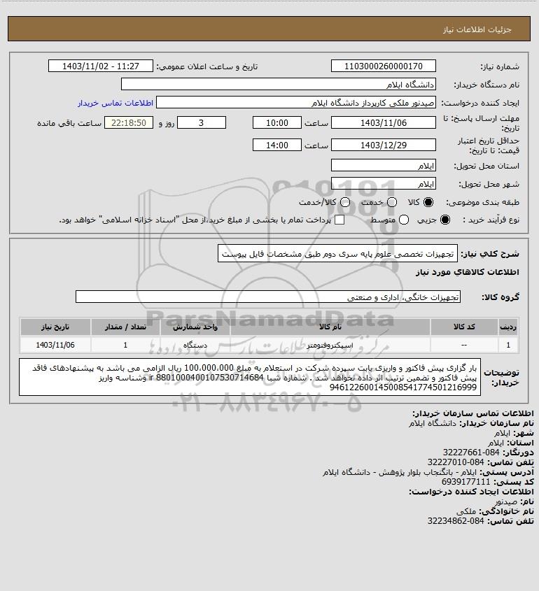 استعلام تجهیزات تخصصی علوم پایه سری دوم طبق مشخصات فایل پیوست, استعلام تجهیزات تخصصی علوم پایه سری دوم طبق مشخصات فایل پیوست