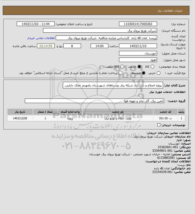 شرح کلی نیاز: پروژه اصلاح و بازسازی شبکه برق روستاهای شهرستان رامهرمز تملک دارایی.