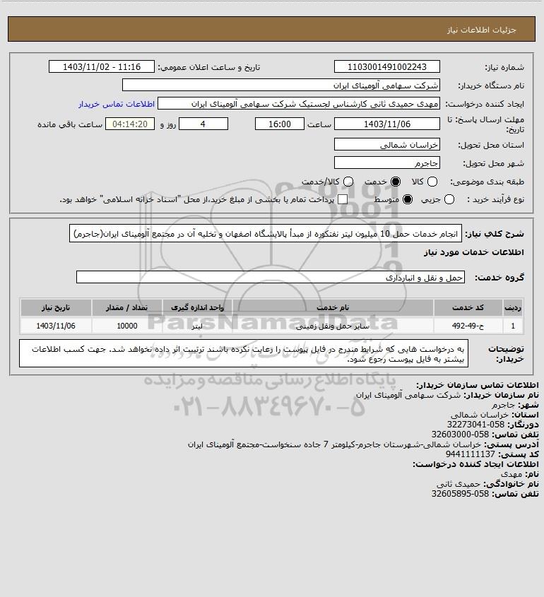 شرح کلی نیاز: انجام خدمات حمل 10 میلیون لیتر نفتکوره از مبدأ پالایشگاه اصفهان و تخلیه آن در مجتمع آلومینای ایران(جاجرم)