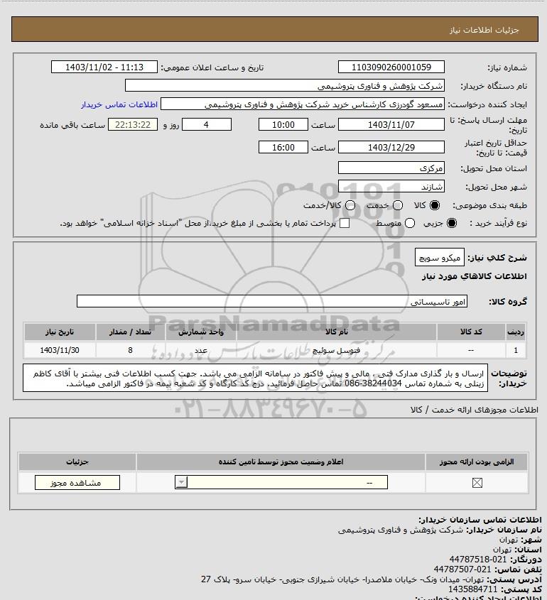 استعلام بها و موضوع استعلام استعلام میکرو سویچ به اطلاع کلیه شرکتها و افراد متخصص واجد شرایط میرساند، آگهی گذار در نظر دارد از طریق استعلام بها، نسبت به انتخاب و دریافت پیشنهادات اقدام نماید. این استعلام با کد آگهی ثبت شده در سامانه خبرگزاری پارس نماد : 8566010 منتشر شده است. مشخصات استعلام : تاریخ شروع استعلام: 1403/11/02 آخرین مهلت ارسال پیشنهاد قیمت : 1403/11/07 و محل اجرای پروژه : استان مرکزی میباشد. استعلام قیمت مورد درخواست : استعلام میکرو سویچ با دستهبندیهای تخصصی و گروه های مرتبط : ابزار دقیق, انواع کلید و پریزهای برقی و صنعتی, تجهیزات نفت و گاز, استعلام اطلاع رسانی میگردد.