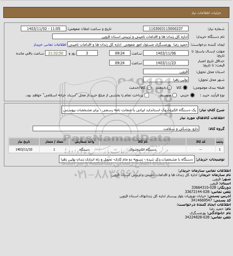 شرح کلی نیاز: یک دستگاه الکتروشوک استاندارد ایرانی با ضمانت نامه رسمی - برابر مشخصات پیوستی