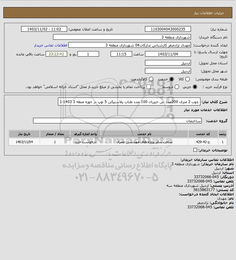 شرح کلی نیاز: چوب 2 متری 200عدد نی خیزران 100 عدد طناب پلاستیکی 5 توپ در حوزه منطه 3 1403-1