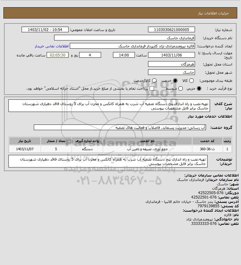 شرح کلی نیاز: تهیه،نصب و راه اندازی پنج دستگاه تصفیه آب شرب به همراه کانکس و مخزن آب برای 5 روستای فاقد دهیاری شهرستان جاسک برابر فایل مشخصات پیوستی