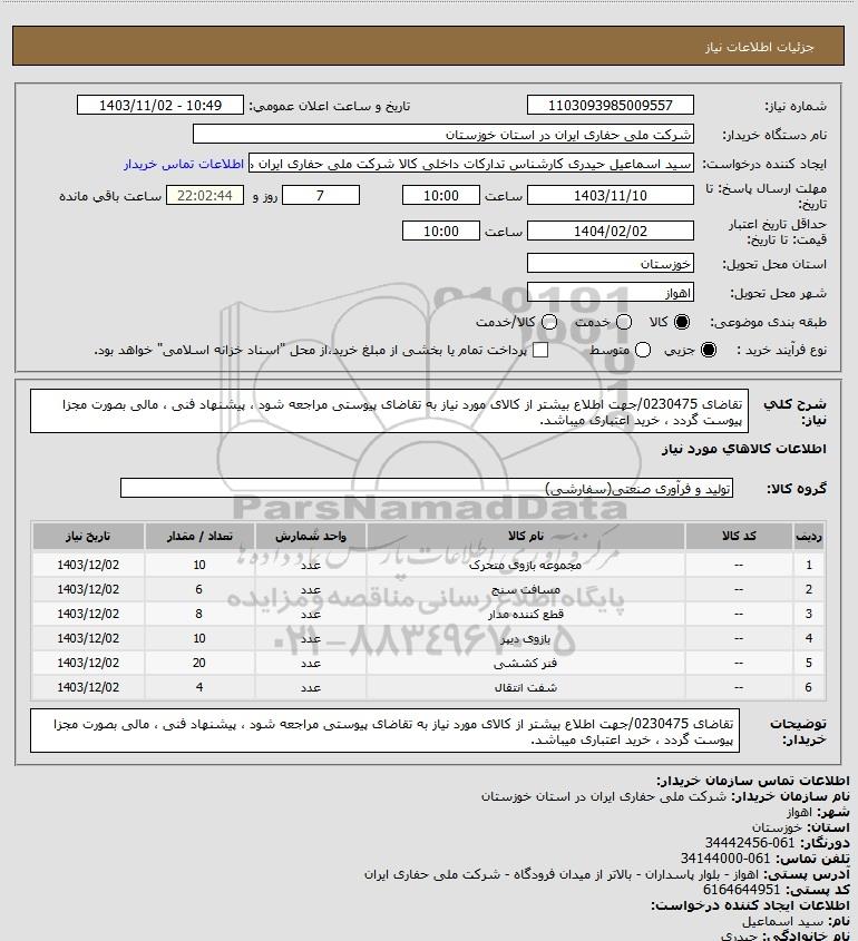 توضیحات خریدار:تقاضای 0230475/جهت اطلاع بیشتر از کالای مورد نیاز به تقاضای پیوستی مراجعه شود ، پیشنهاد فنی ، مالی بصورت مجزا پیوست گردد ، خرید اعتباری میباشد.