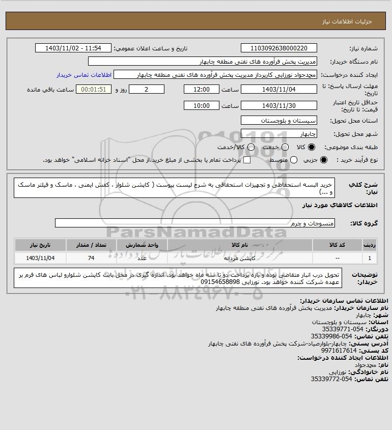 شرح کلی نیاز: خرید البسه استحفاظی و تجهیزات استحقاقی به شرح لیست پیوست ( کاپشن شلوار ، کفش ایمنی ، ماسک و فیلتر ماسک و ...)