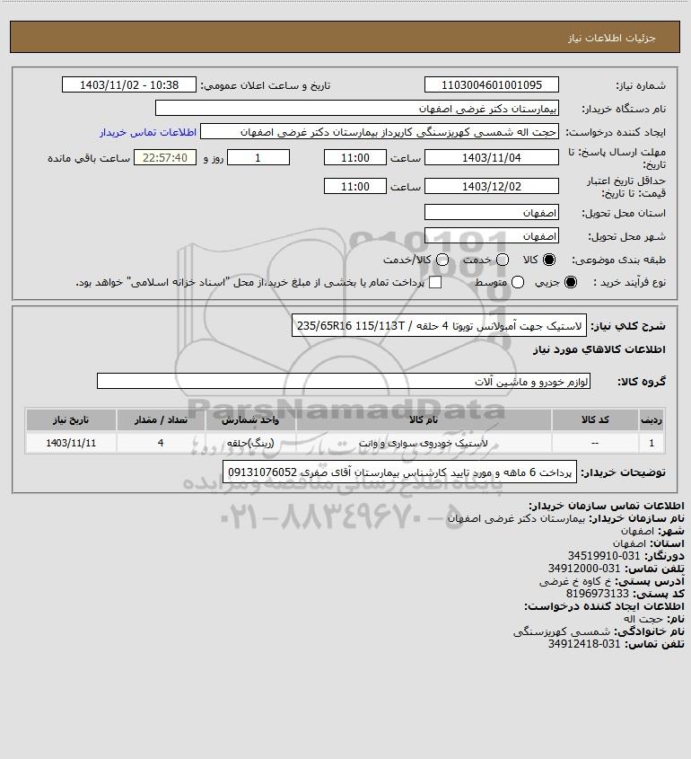 شرح کلی نیاز: لاستیک جهت آمبولانس تویوتا 4 حلقه / 235/65R16
