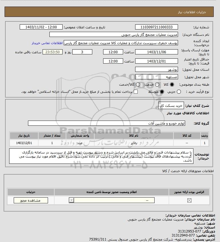 استعلام بها و موضوع استعلام استعلام خرید بسکت کار به اطلاع کلیه شرکتها و افراد متخصص واجد شرایط میرساند، آگهی گذار در نظر دارد از طریق استعلام بها، نسبت به انتخاب و دریافت پیشنهادات اقدام نماید. این استعلام با کد آگهی ثبت شده در سامانه خبرگزاری پارس نماد : 8566358 منتشر شده است. مشخصات استعلام : تاریخ شروع استعلام: 1403/11/02 آخرین مهلت ارسال پیشنهاد قیمت : 1403/11/06 و محل اجرای پروژه : استان بوشهر میباشد. استعلام قیمت مورد درخواست : استعلام خرید بسکت کار با دستهبندیهای تخصصی و گروه های مرتبط : بالابر صنعتی, تامین،تعمیرات و اجاره خودروهای سنگین و نیمه سنگین, سازه های فلزی و فضایی, جرثقیل, قطعات خودرو, استعلام اطلاع رسانی میگردد.
