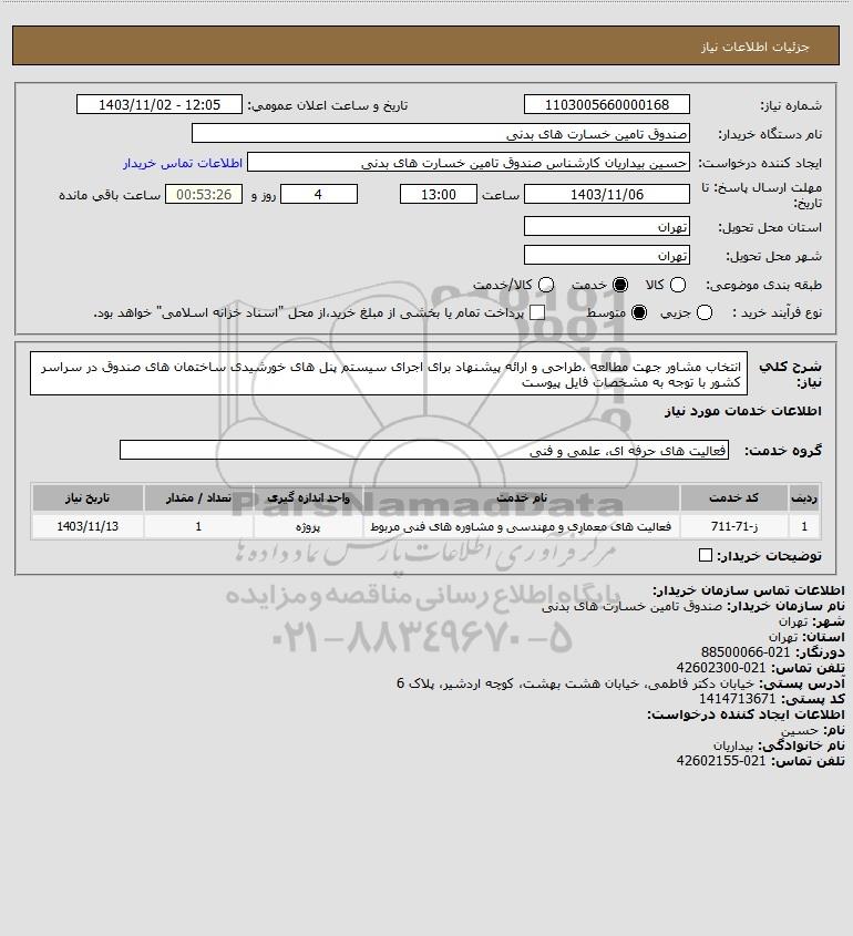 استعلام انتخاب مشاور جهت مطالعه طراحی و ارائه پیشنهاد برای اجرای سیستم پنل های خورشیدی ساختمان های صندوق در سراسر کشور با توجه به مشخصات فایل پیوست, استعلام انتخاب مشاور جهت مطالعه ،طراحی و ارائه پیشنهاد برای اجرای سیستم پنل های خورشیدی ساختمان های صندوق در سراسر کشور با توجه به مشخصات فایل پیوست