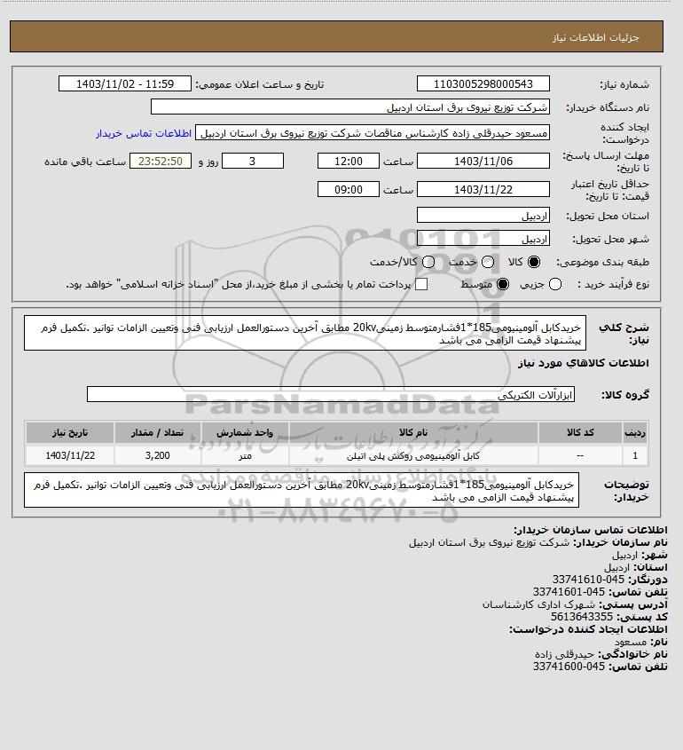 شرح کلی نیاز: خریدکابل آلومینیومی185*1فشارمتوسط زمینی20kv مطابق آخرین دستورالعمل ارزیابی فنی وتعیین الزامات توانیر .تکمیل فرم پیشنهاد قیمت الزامی می باشد