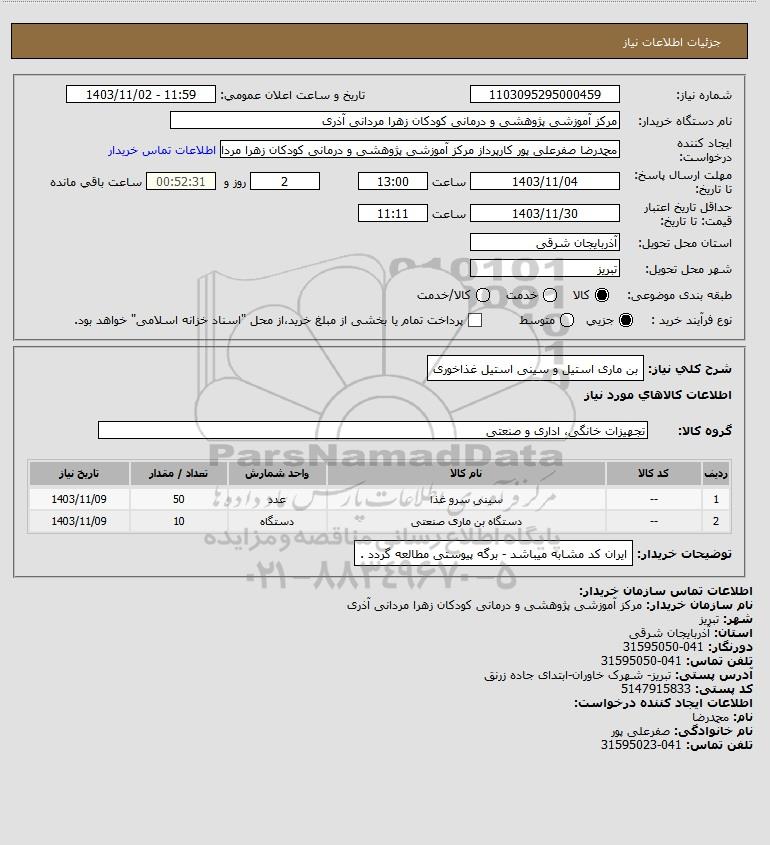 شرح کلی نیاز: بن ماری استیل و سینی استیل غذاخوری