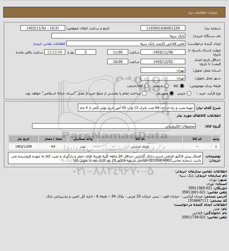 | 1 | -- | باتری حرارتی | عدد | 64 | 1403/11/09 |